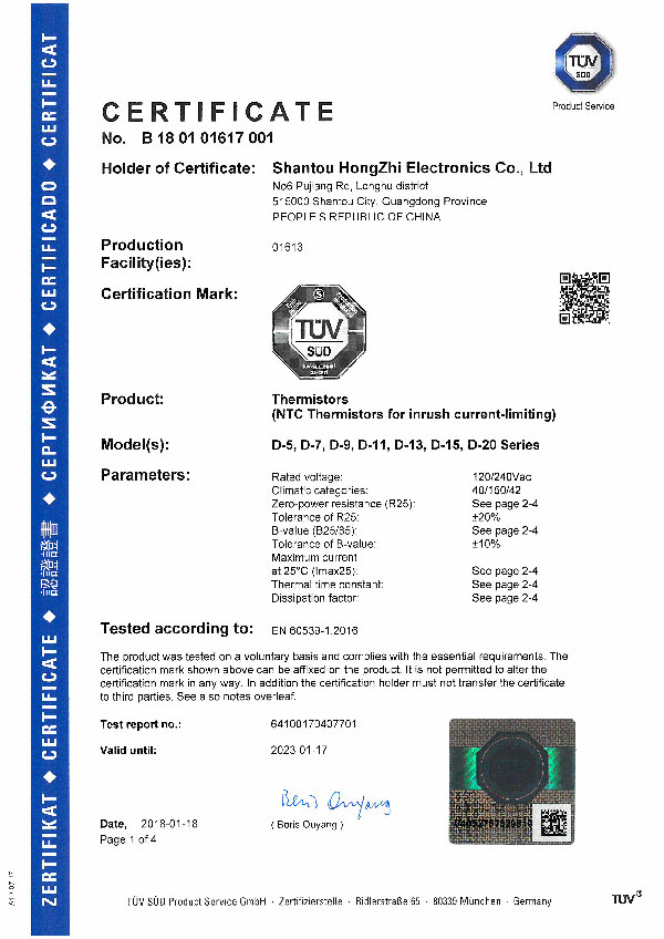 2018年1月,汕頭市鴻志電子有限公司生產(chǎn)的NTC熱敏電阻獲得德國TUV認證;至此我司熱敏電阻共有德國TUV.美國UL.中國CQC和美國CUL四個認證。